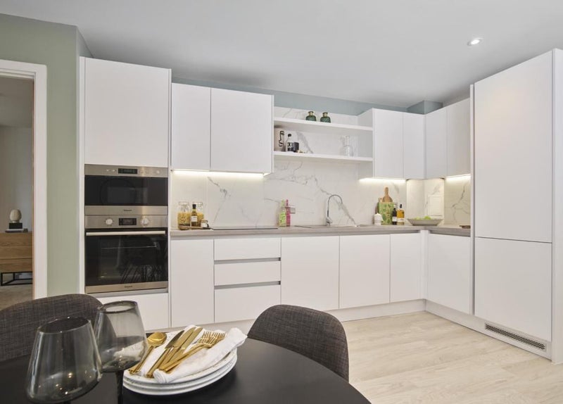 The flat comes with a modern kitchen and living space including a sofa and TV. There is a small utility area with a washing machine and a dryer.