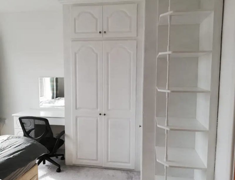 Super comfortable king size bed with fitted furniture, desk and walk-in wardrobe. It has lots of storage space!