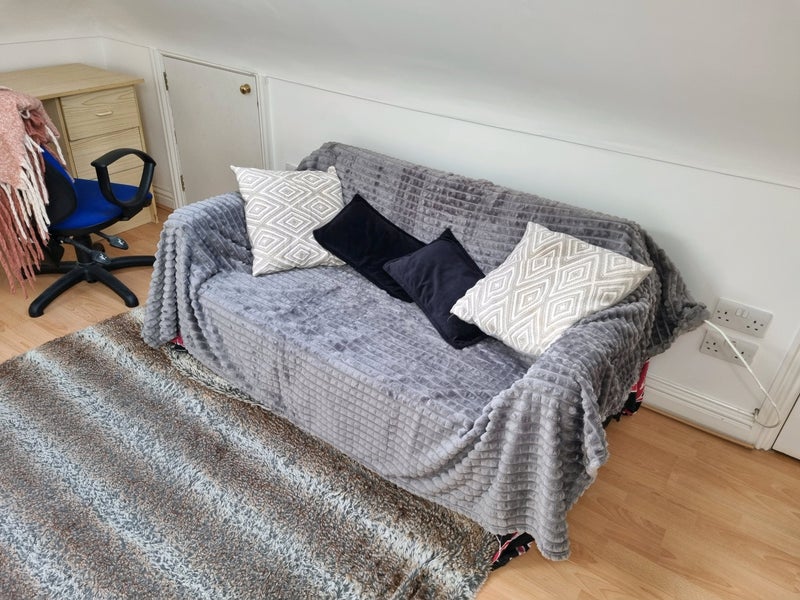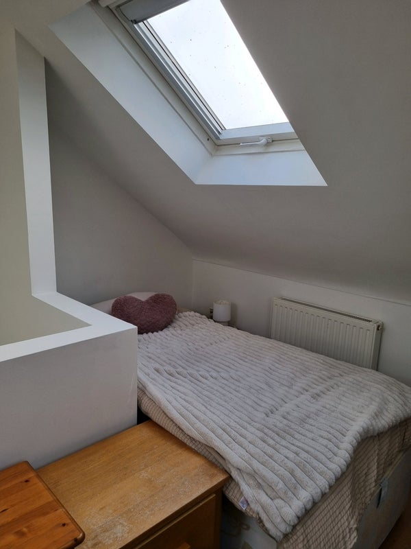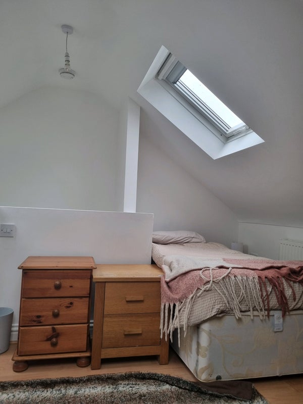large attic room.. lots of light. very private. near bathroom and toilet. has single bed but room for a double. has desk for students and sofa bed .like a mini studio. just redecorated today. will be buying new accessories.. like throws etc