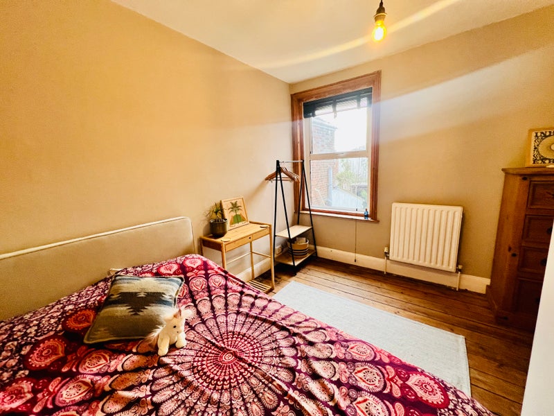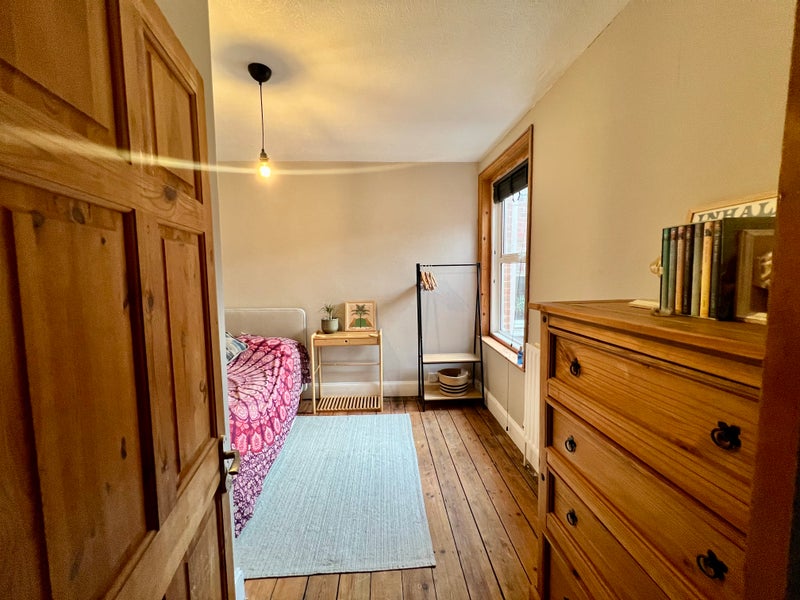 Its a double (recently decorated) with traditional Victorian wooden flooring and south west facing which will get a nice bit of sunshine late morning into the afternoon. Includes a double bed, chest of draws and clothes rail at the moment but quite flexible with requests.