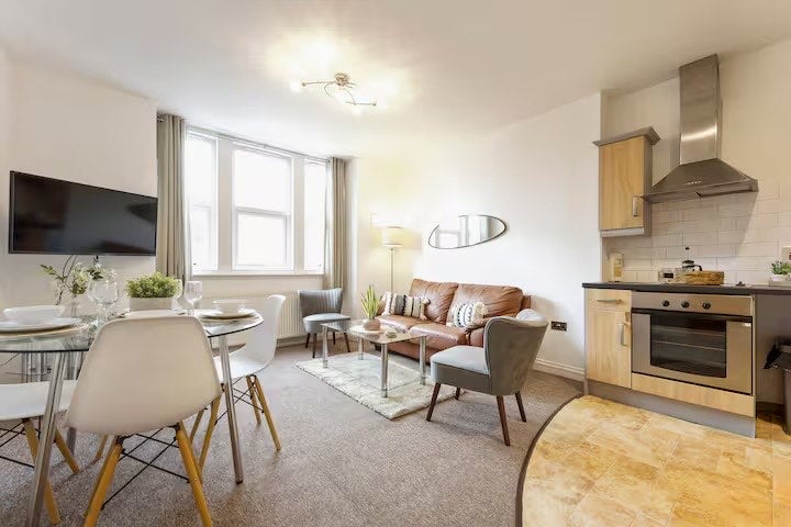 Relax in a light-filled living area inspired by the coast, ideal for slow mornings or winding down after a beach day. The full kitchen has everything you need for home-cooked meals, picnics or breakfast before heading out. The peaceful bedroom offers a comfortable retreat after exploring Bournemouth’s beaches, gardens and vibrant town centre.