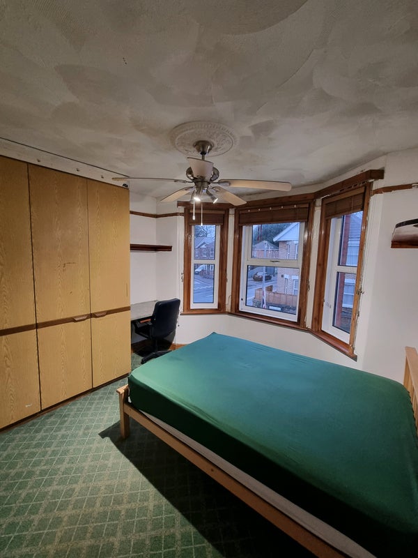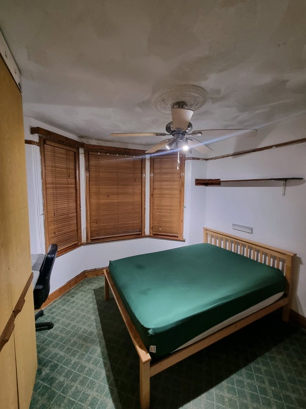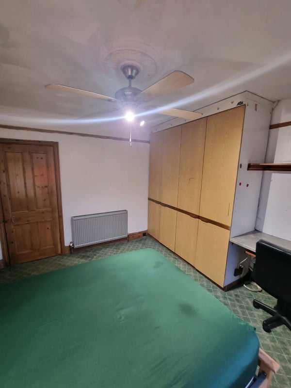 The room is next to the upstairs bathroom which has a bath and shower and their is also a downstairs toilet too in the kitchen their is also the garden to chill out in and the kitchen is a shared although not many of us cook a lot mainly just make tea and coffee that is about it but my dogs stay in the kitchen they are quiet most of the time and just chill it is a mixed household.