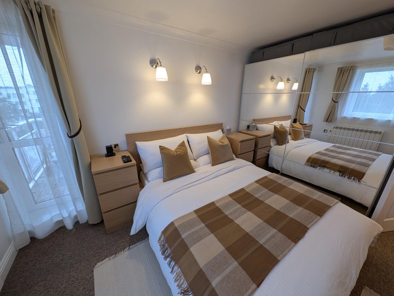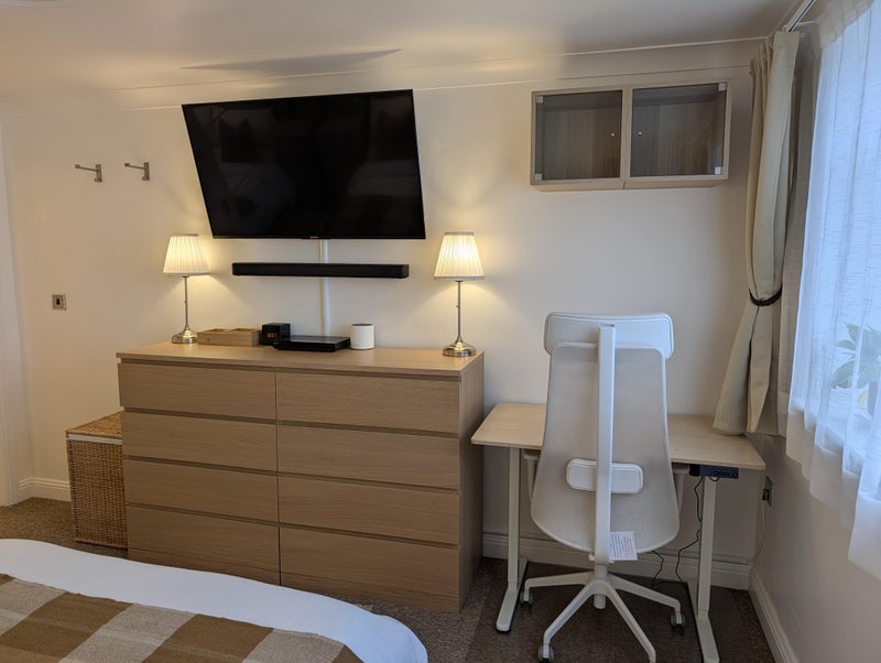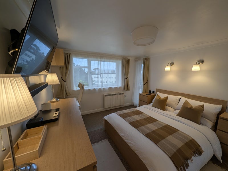 The room comes with a king size bed with a memory foam mattress, two 3-drawer bedside tables, a double chest of drawers with 8 ample drawers, a double wardrobe with mirror sliding doors and 4 meters of clothes railing, a height adjustable desk, a leather ergonomic swivel chair, a 49" wall mounted smart TV and soundbar, black-out curtains and tilt-and-turn windows. A distinct feature to this room is a private balcony furnished with wood decking, a recliner chair and a side table.