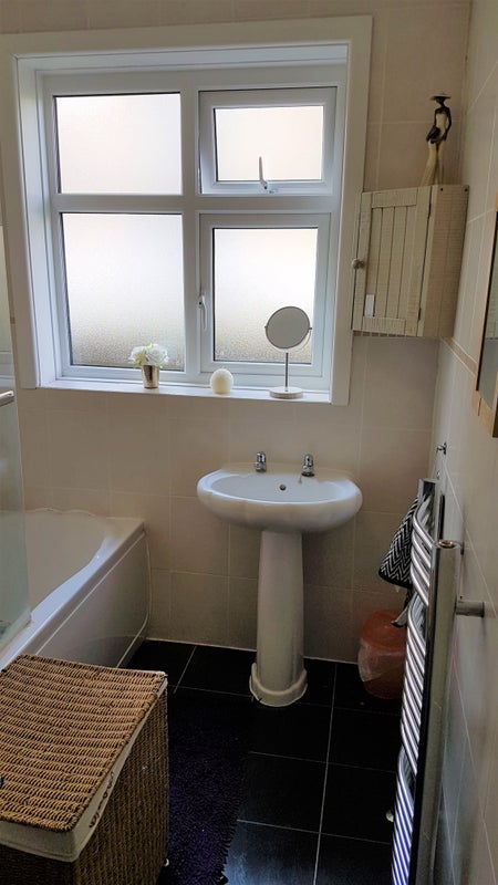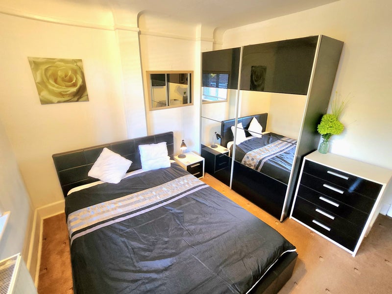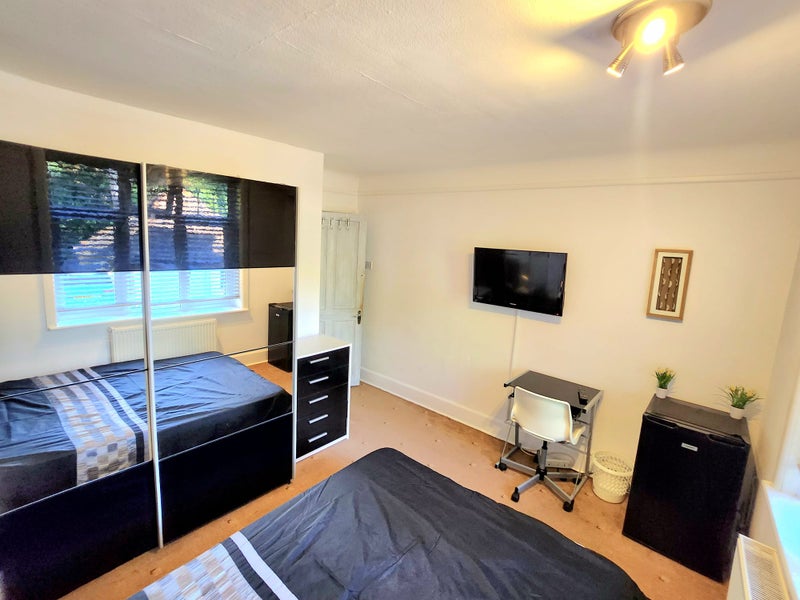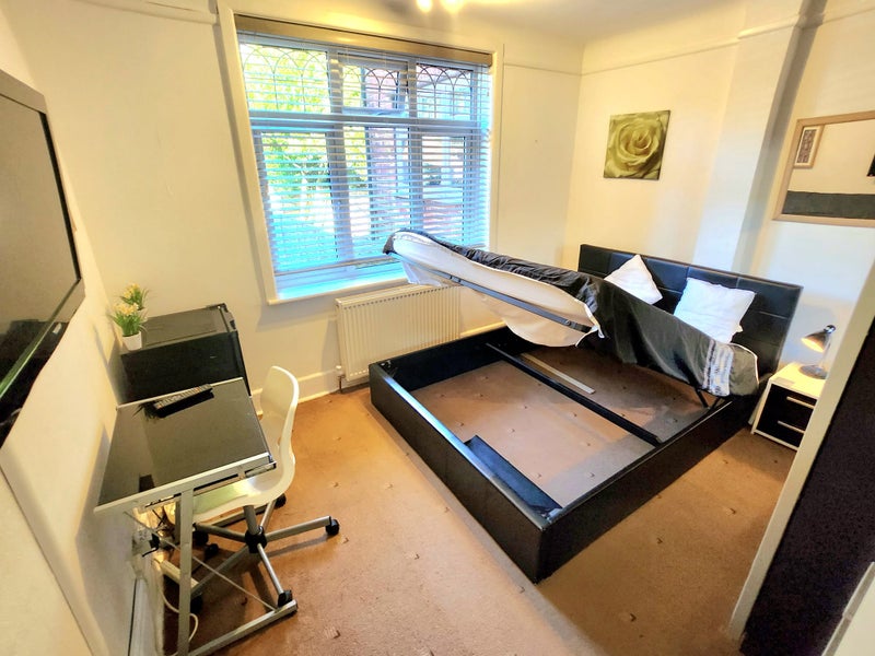 Furnished double room to rent with king size storage bed, 32" tv, huge mirrored wardrobe and a Fridge. All bills are included with fast wifi. Washing machine and tumble dryer use included. Rotary line in garden and bicycle rack. Shared Kitchen with cooking facilities and all pans, crockery and utensils supplied. Shared bathroom (With Only one other professional person)