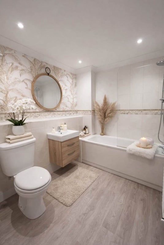 The modern bathroom is stunning with moroccan style tiles, large bath and rain shower.