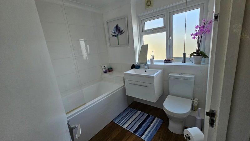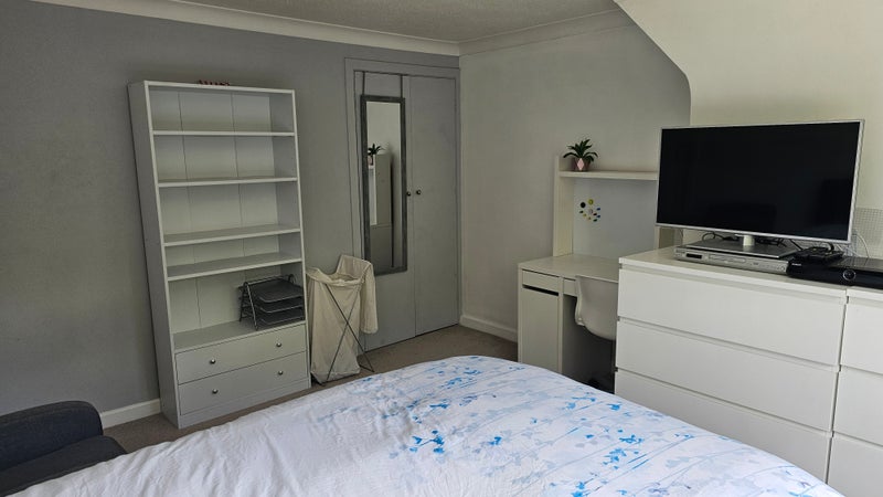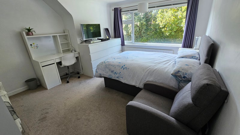 The bedroom is fully furnished and includes a newish small double bed and mattress, desk and chair, recliner arm. chair, 2 chest of drawers, a built in wardrobe, bedside table and lots of storage under the bed (ottoman style bed). I have my own ensuite so you will mainly be sharing the bathroom with one other. There is a second separate toilet downstairs.