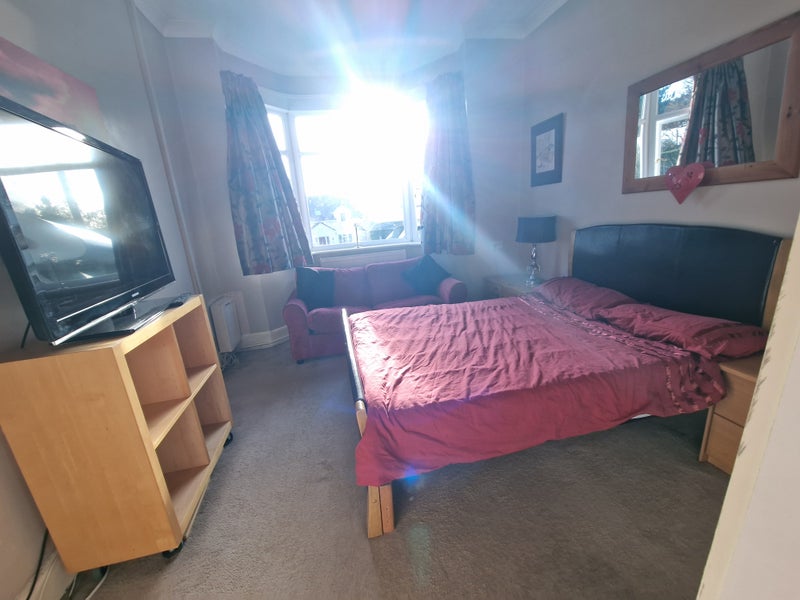 The room is furnished with a double bed, bedside cabinets, chest of drawers, wardrobe