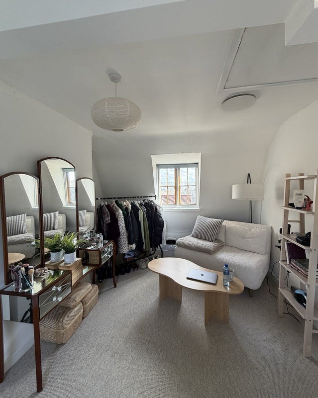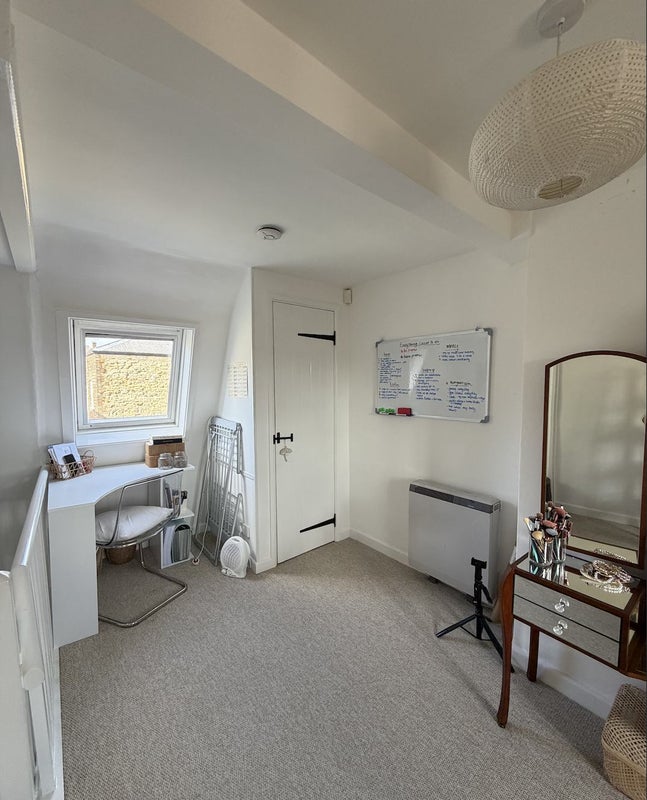 - Large loft room that can be used as a living room, second bedroom, or workspace, sofa bed (can be made into a comfortable bed with mattress toppers provided), desk / study area and dressing table, additional storage / airing cupboard