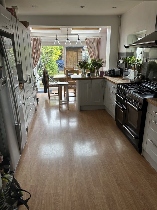 The Kitchen is fully equipped with utensils and appliances and their is a dinning area. There is use of a washing machine and plenty of room for drying. Also a small garden with outdoor seating, and a shed with room for a bike if required.
