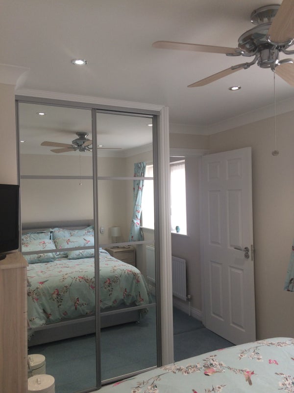Room 2: Overlooking front of property. Double bed with storage, 2 freestanding double mirrored wardrobes with hanging rail and shelving - draw beneath. Chest of draws. Bedside cabinet. New wall mounted TV with apps. Ceiling fan and air conditioning.