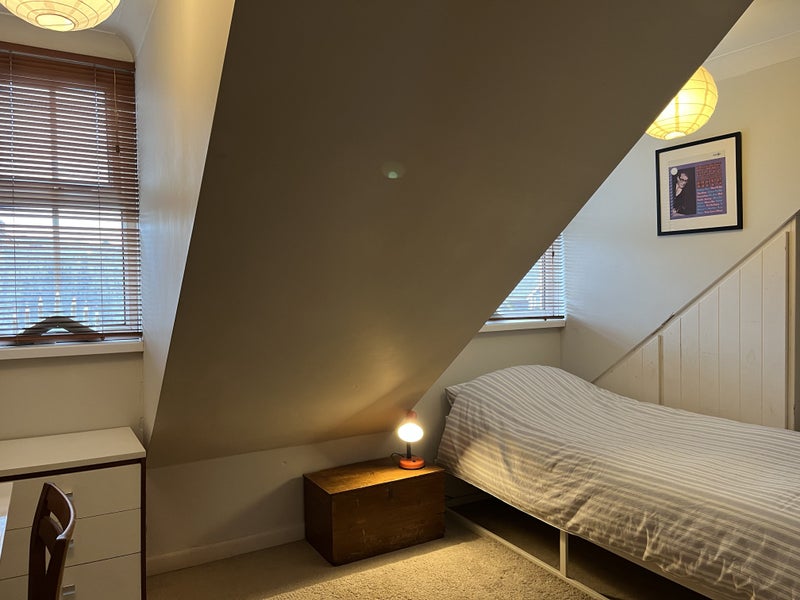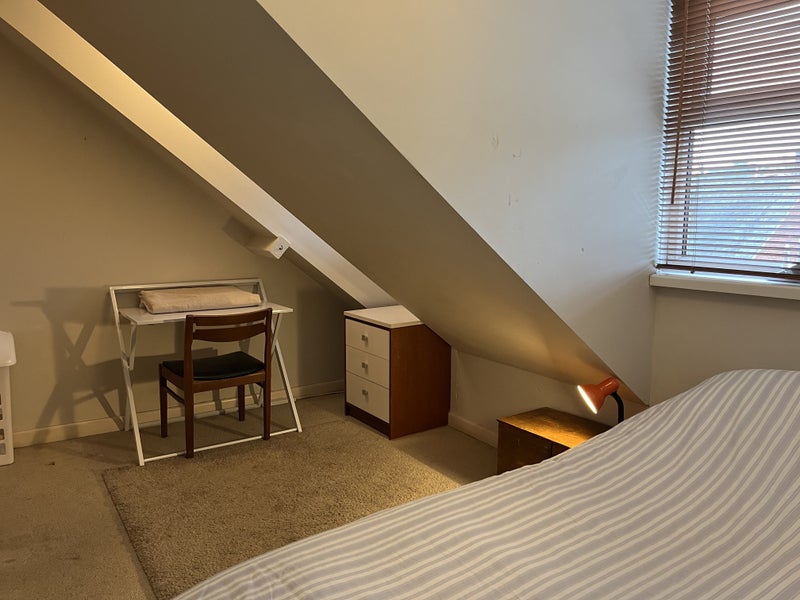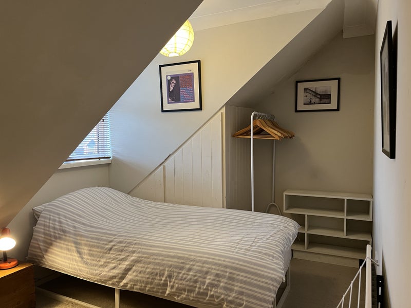 Cosy furnished attic room, with single bed, chest of drawers, hanging area, bookcase, shelf unit, small desk and chair.