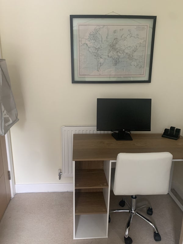 You will have a large, bright room with double bed, desk, plenty of cupboard / wardrobe space and streaming TV with fire stick. We have super fast upload and download speeds.