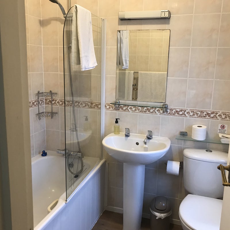 KINGSIZED bed, comfy chairs, double wardrobe, large chest of drawers and big flatscreen t. v.. Ensuite with bath, shower, toilet and sink.