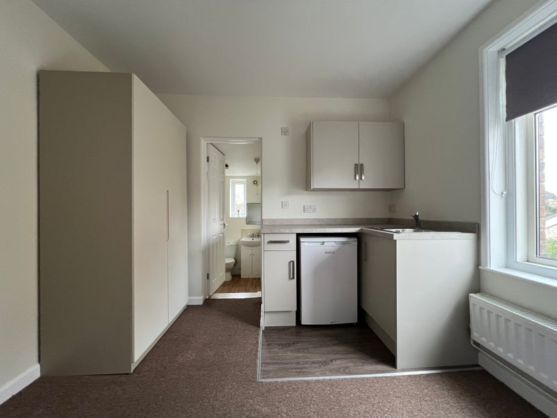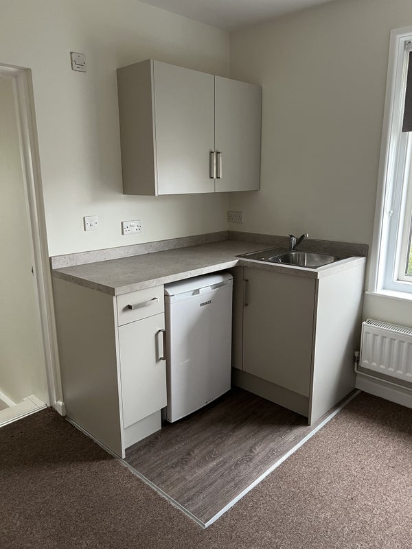o Newly fitted modern kitchenette area with sink, worktop, storage units and fridge