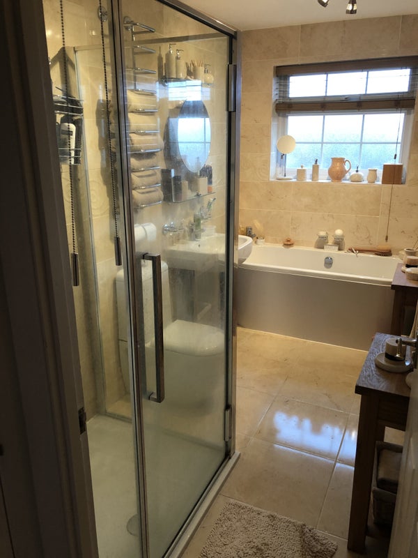 - Shared bathroom with separate power shower and bath