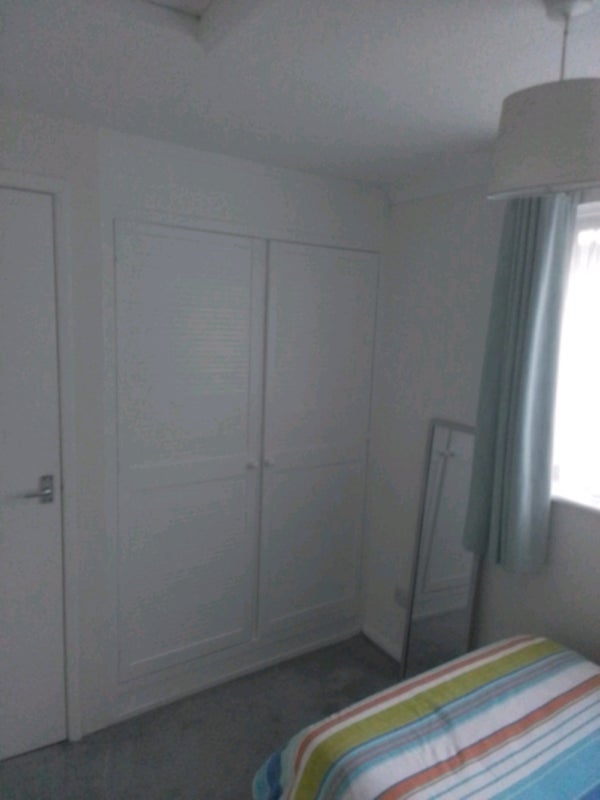 Single bed with fresh linens. Wardrobe and storage space.