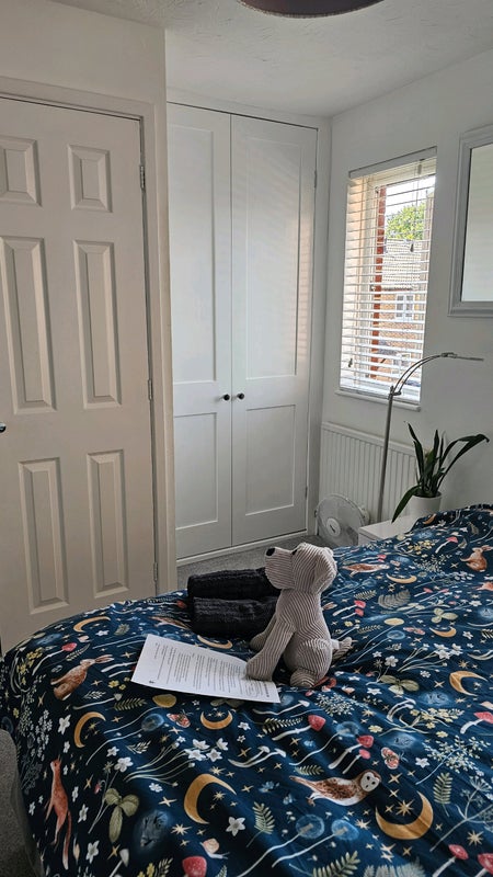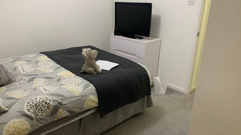The room is furnished with a double bed, cupboards, wardrobe and chest of drawers. Television and broadband provided.