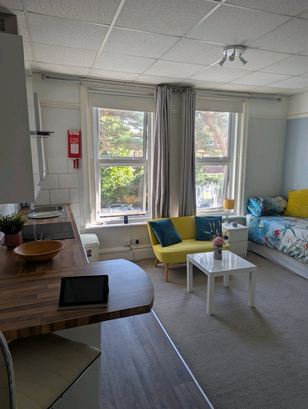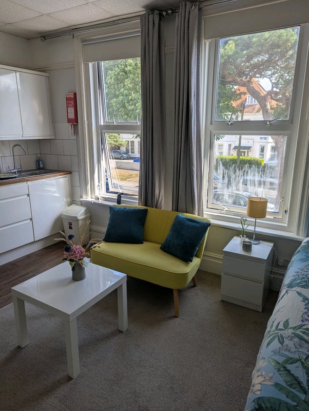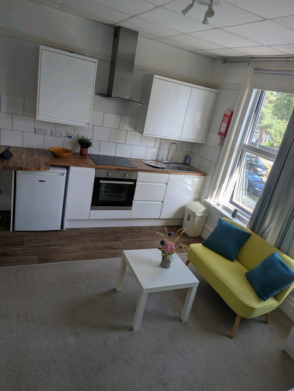 First floor self-contained studio in the heart of Southbourne nestled between the beach and The Grove High Street. Furnished with a single bed that can convert into a double. Kitchen includes an induction hob and oven. Bright and airy room with own bathroom, hot desk/breakfast bar and seating area. WiFi is included in the price. Electric and water not included (approximately £60 per month) and the council tax is a band A. Would suit a quiet resident who wants to make a permanent move to this stunning area. Minimum stay preferably 12 months, but negotiable. Our communal area is quiet and has recently been refurbished to a high standard. Deposit is equivalent to one month's rent. References required. Launderette approx 5 mins. walk.