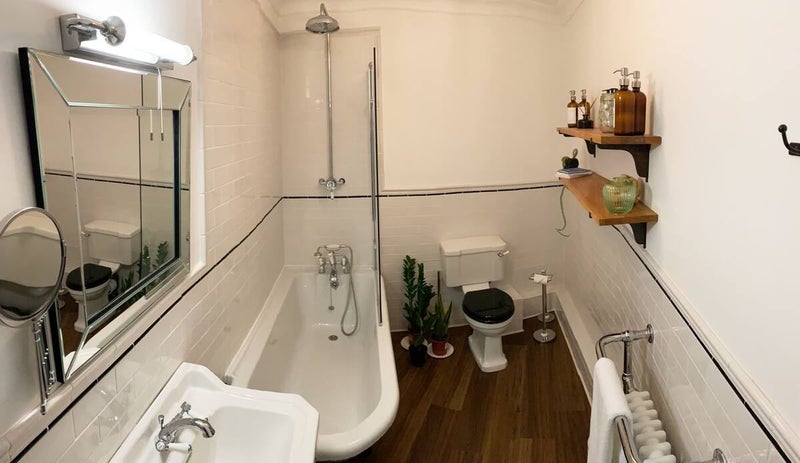 The bathroom is decorated in a period style and houses the toilet, roll-top claw-foot bath with rain-head shower over and bath shower attachment, sink, mirror, shelving and hanging hooks.