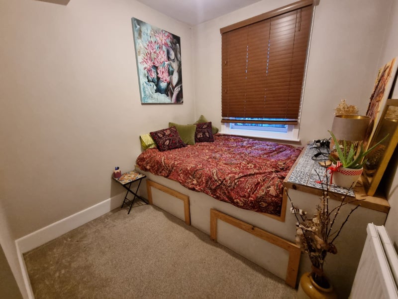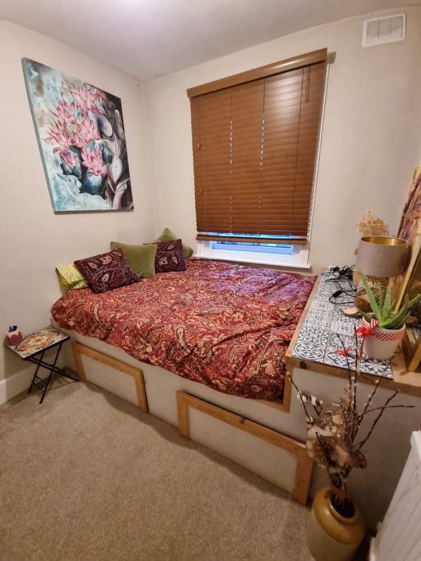 • Small cosy room with built-in double bed, space for drawers, plus extra storage in shared areas.