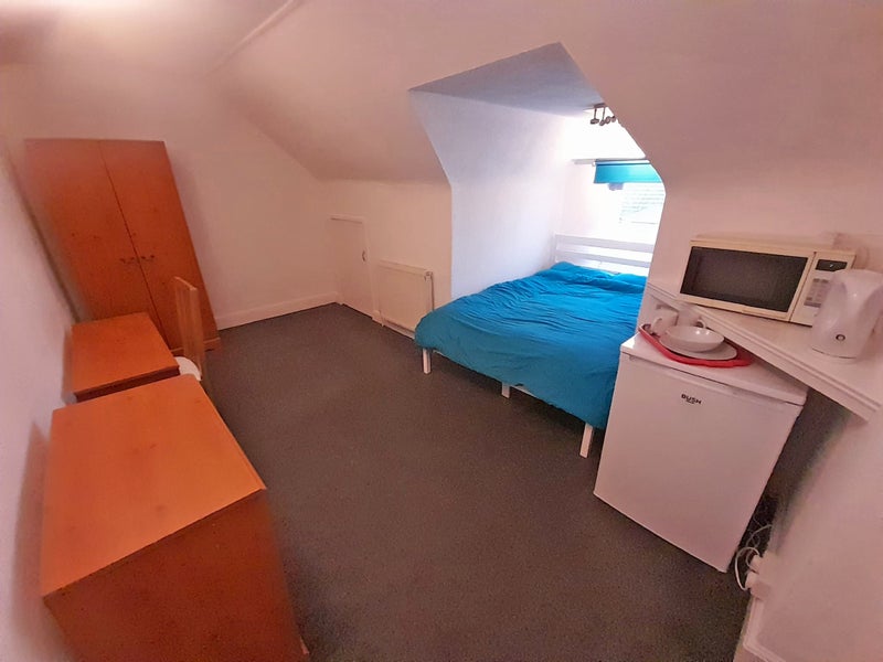 The room is nice and bright and has; a double bed with 1 set of bedding, a wardrobe, chest of drawers, fridge, radiator and a basin.