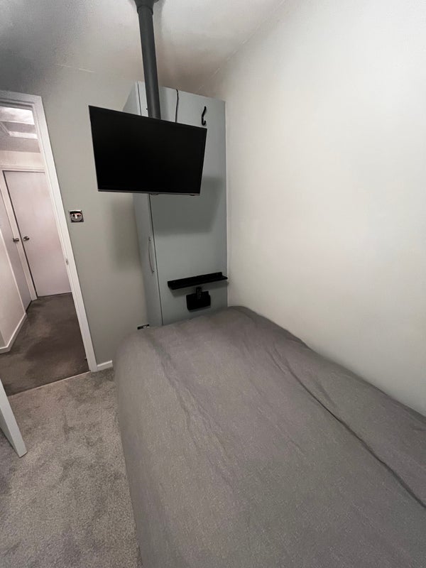 Bedroom consists of a single bed with two storage drawers, wardrobe and a chest of drawers. The room has a ceiling TV arm which can hold a large TV. Whilst the room is not en-suite, you will be the only person to use the family bathroom which is cleaned once a month.