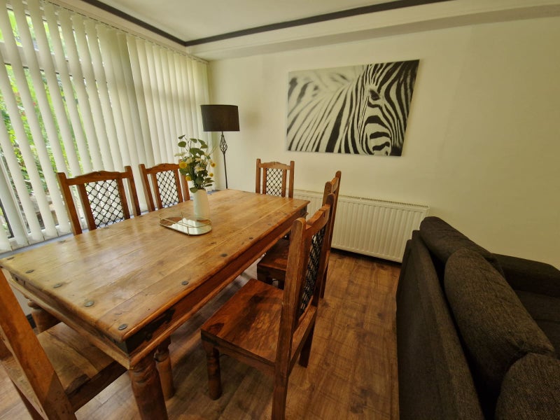 There are two washing machines and a dryer, with outside clothes hanging and a couple of clothes airers. Relaxing sofa recliner, breakfast bar and large dining table with coat hanging and shoe rack.