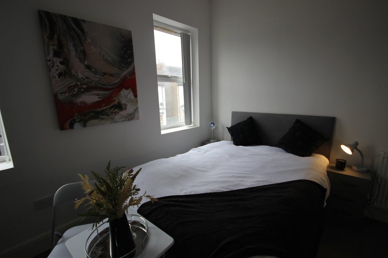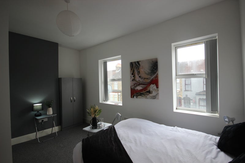 The room is bright and airy, boasting two large windows that fill the space with natural light. It comes furnished with a comfortable double bed, mattress, bedside tables with lamps, and generous wardrobe space for all your storage needs. A small table and chair are also provided, creating a convenient spot for working or studying.