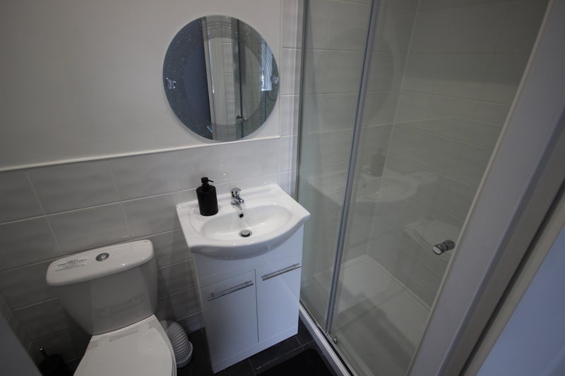 The modern en-suite bathroom features a shower, toilet, and sink, offering privacy and convenience.