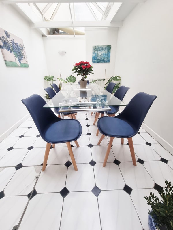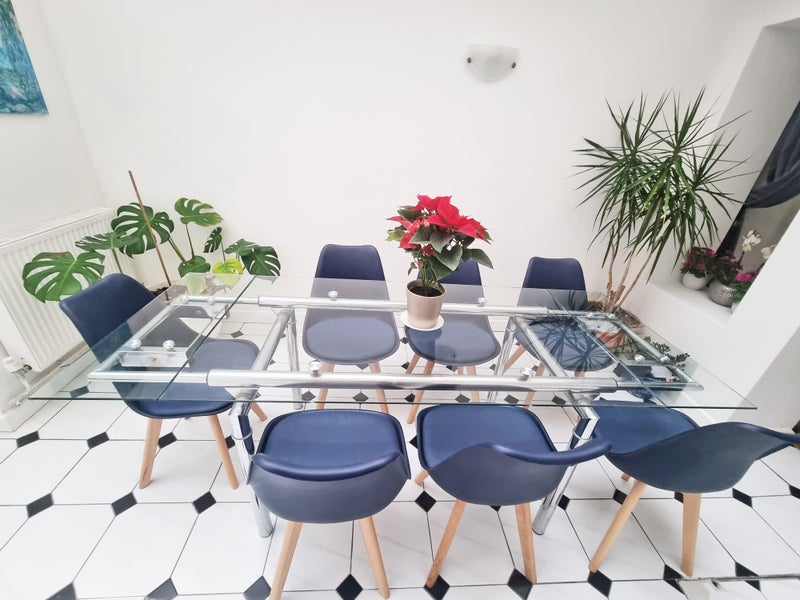 • Extendable glass dining table.