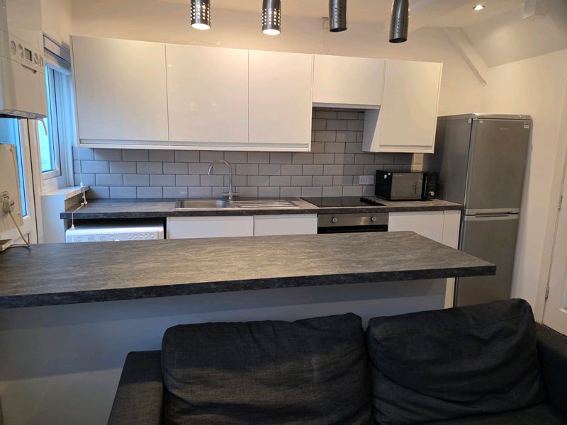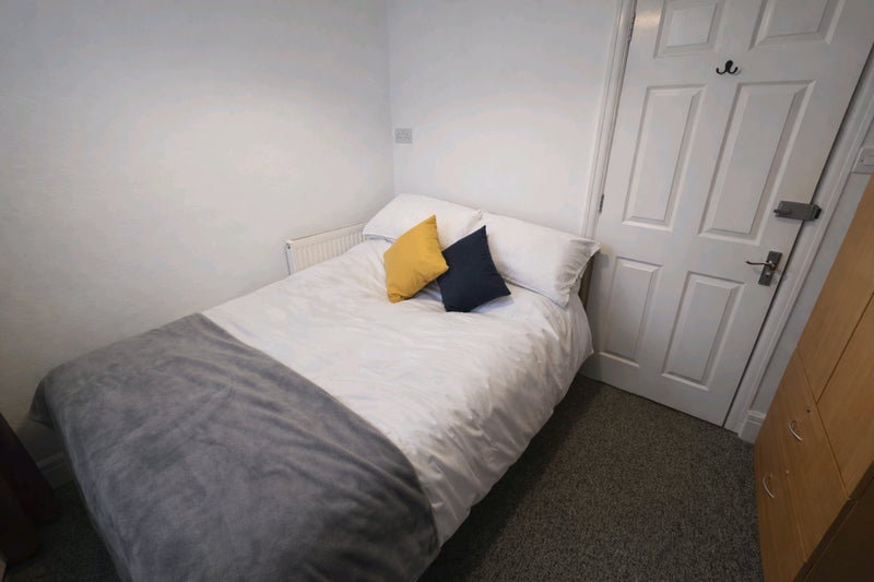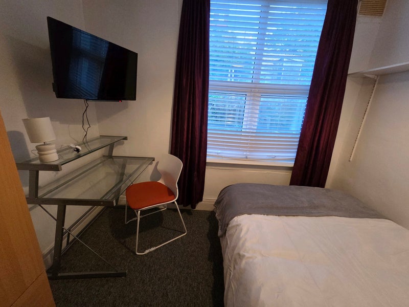 This is a large 6 bedroom house set across 3 floors. There is a shared open plan kitchen and lounge. There is an outside patio garden. The room is fully furnished with a double bed, a double wardrobe, and a desk. It also comes with a smart TV.