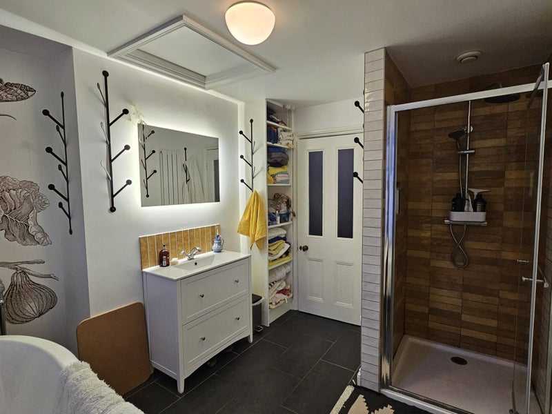 The bedroom has a small wardrobe, additional hooks behind the door, a floor to ceiling cupboard, two bedside tables, a table and chair. I am flexible on furniture and you may prefer to have your own bedding. There's a view from the window and afternoon/evening sun.