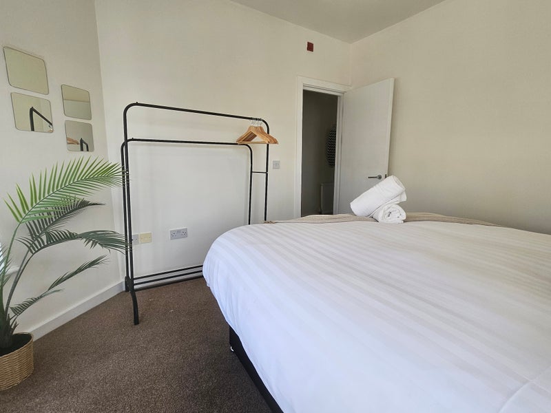 The bed is king size, bedside tables with lamps and and railings for clothes and shoes.