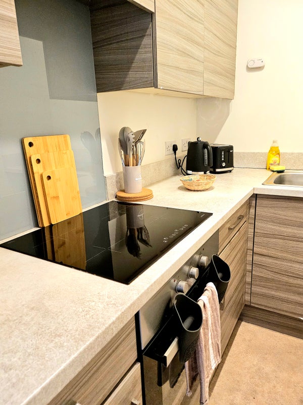 The fully equipped kitchen includes fridge-freezer, oven, electric hob, washing machine, toaster, kettle, utensils, plates, cups, pots and pans.