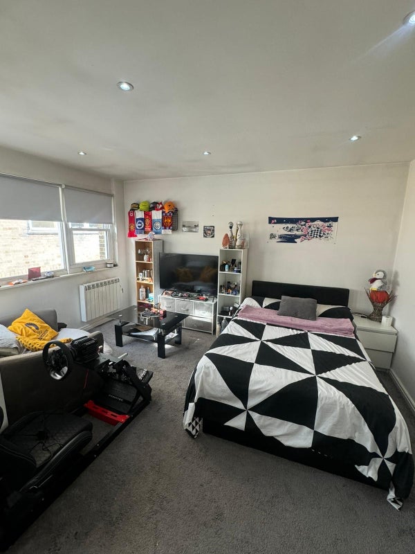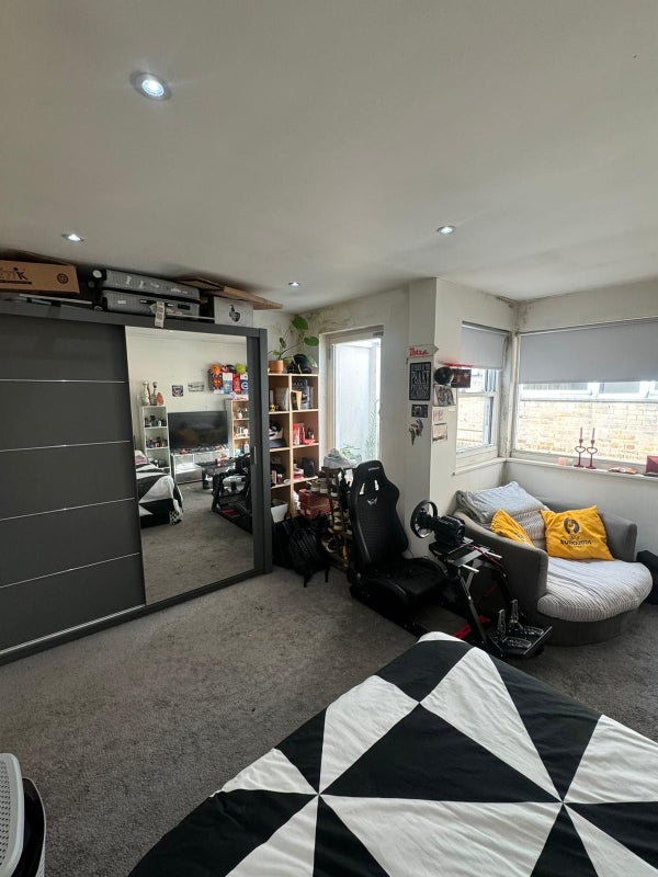 The bright room comes with a big wardrobe, bed, little sofa and its own balcony. There’s loads of storage, plus the option to buy extra furniture from the current flatmate.