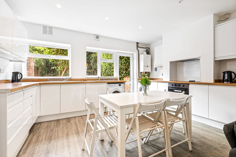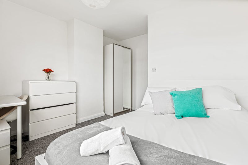 This is a luxury newly renovated house set across 4 floors. The ground floor consists of an open plan kitchen, dining and living area space. The rooms are fully furnished with a double bed and bedside table, a wardrobe, desk and chest of drawers. The further 3 floors consist of 2 bedrooms and a bathroom on each floor. Therefore you would only share a bathroom with one other person. One double room is a small double - the price per month reflects this.