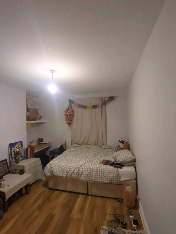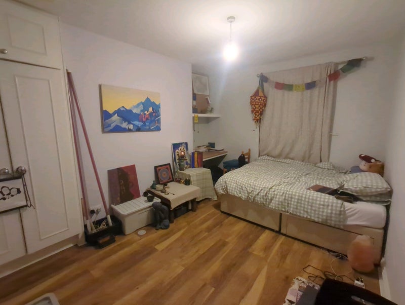 Wooden floor, built in wardrobe and desk, lots of space for storage. Comes furnished with a double bed.