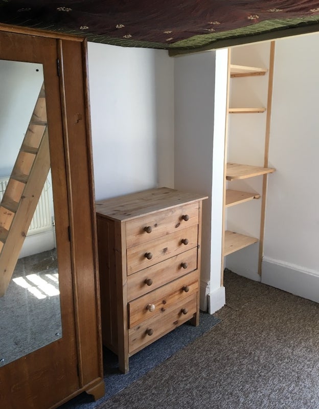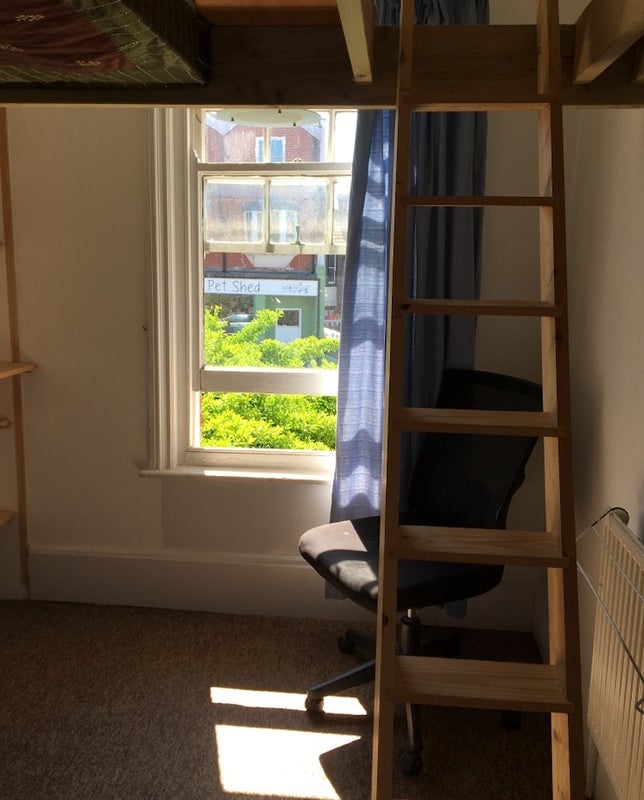 1st room: small, but with a built-in loft double bed, on first floor up one flight of stairs. A south-facing window and view of a friendly elm tree! £600pcm