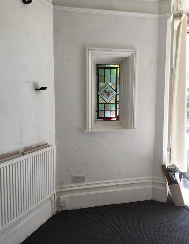 2nd room: huge, with high ceiling, fireplace (not used), built-in wardrobe, shelves and cupboard, on ground floor with south-facing bay window. £750pcm