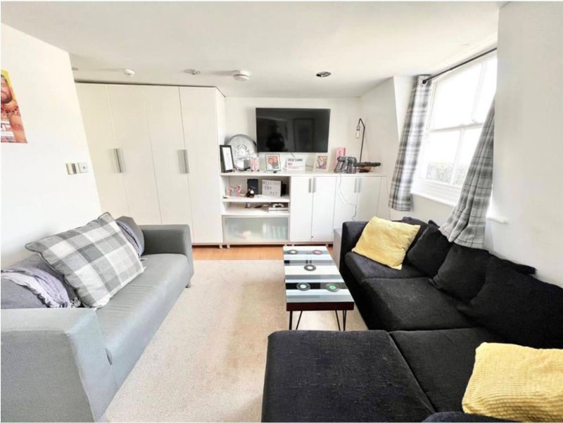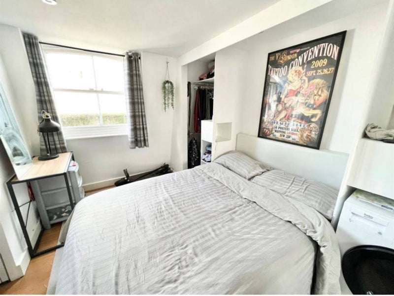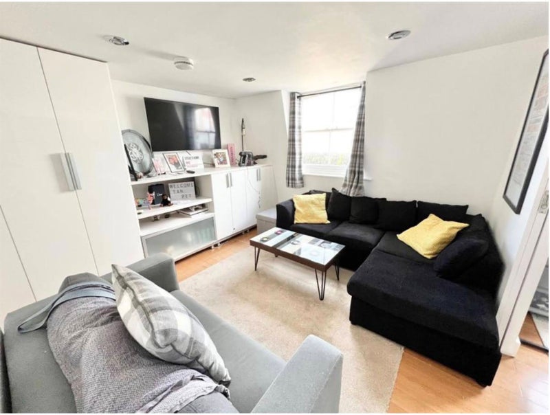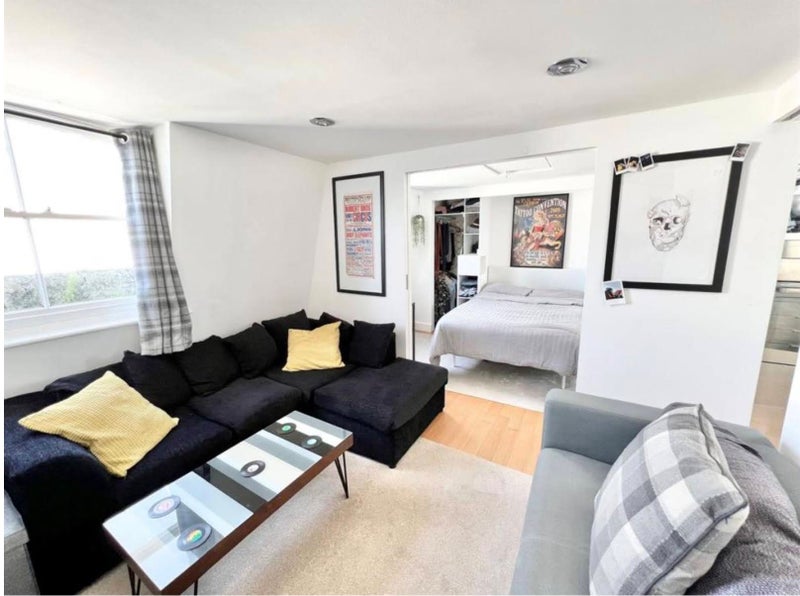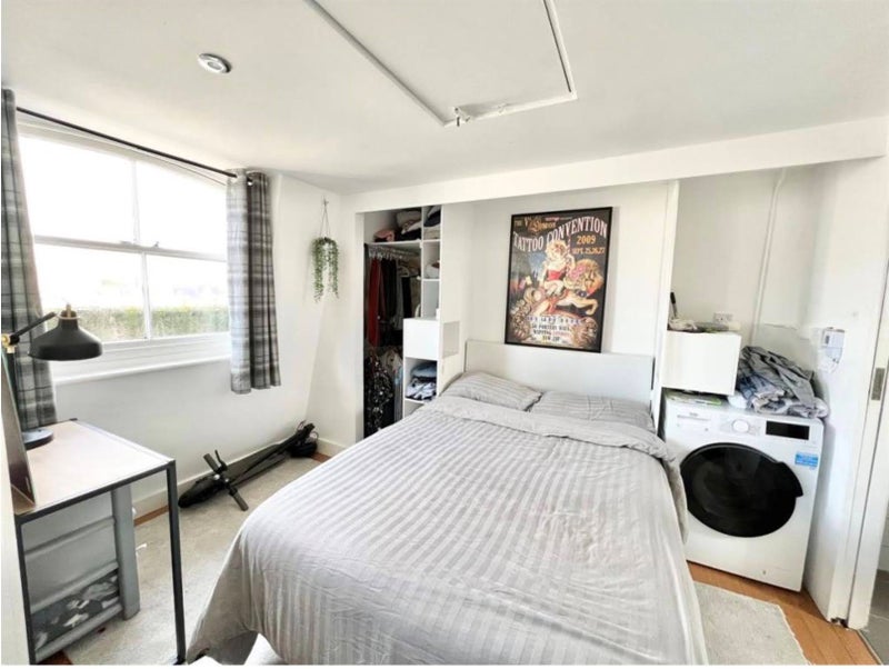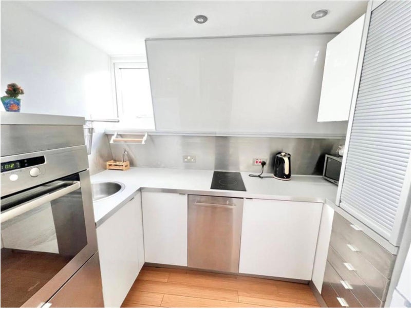 The heart of the home is a bright, well-proportioned lounge featuring traditional sash windows and ample integrated storage. Bespoke sliding doors lead to a versatile bedroom, uniquely equipped with an innovative Murphy bed to maximise floor space, perfect for those who love to entertain.