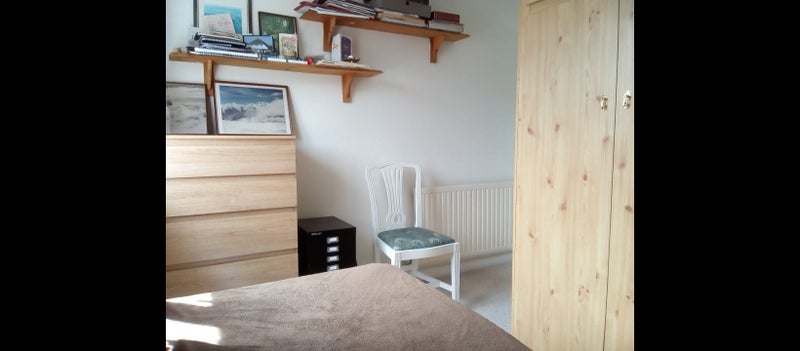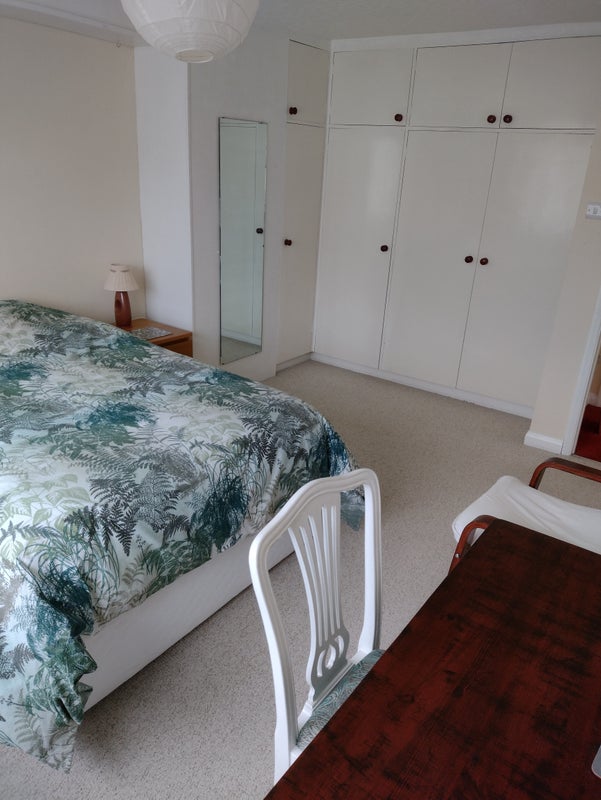 A spacious double room with lots of inbuilt storage cupboards, an arm chair, table and chair (available now).
