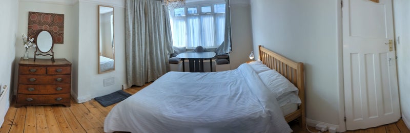 A very large spacious bedroom, 4.6m x 3.3m with large double bed (for single occupancy) and table/desk. In lovely, clean, well maintained house.