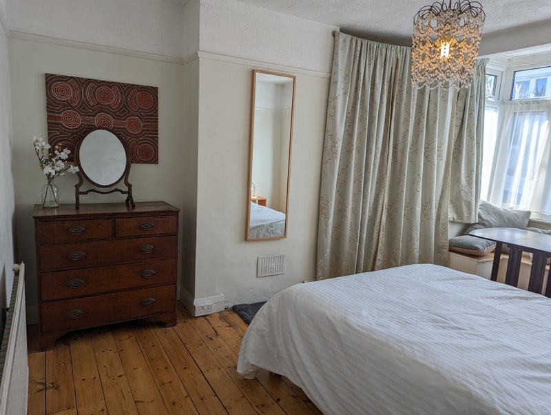 Your bedroom is very large, with plenty of storage (wardrobe, chest of drawers), bench seats in the bay window, chair, table, large double bed, mirrors, bedside table, chandelier, bedside light and desk light. Stripped pine floor.