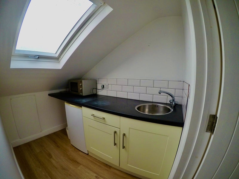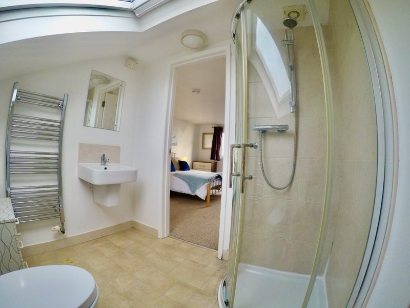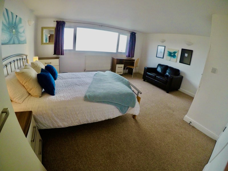 With fantastic views out to sea, this is an unusually large double room with ensuite and kitchenette, spread across the entire top floor of a fully refurbished house 200m from the hospital.
