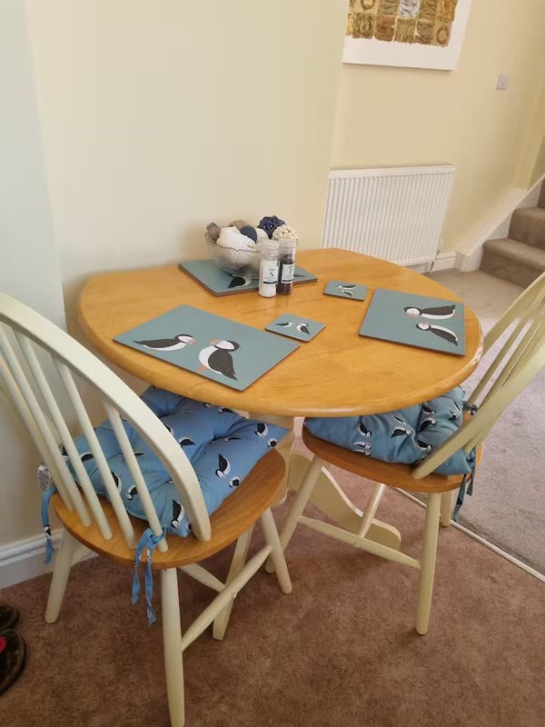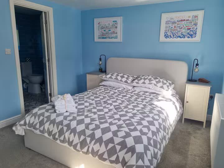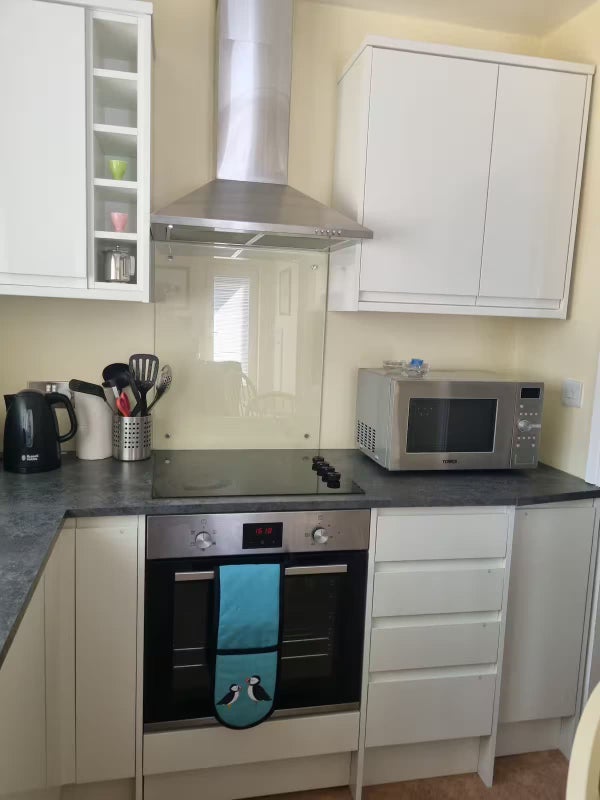 This modern one-bedroom apartment, over 2 floors has wi-fi, a fully equipped kitchen with dining table, a living room area with TV and upstairs a spacious airy double bedroom with an en-suite shower wet room.