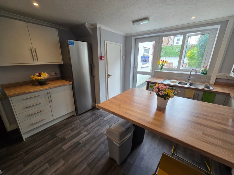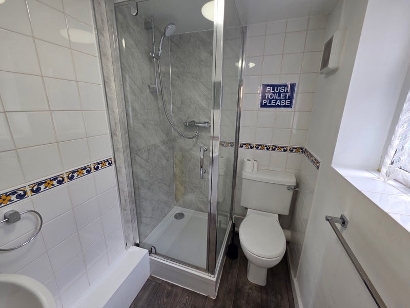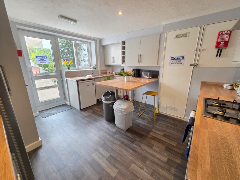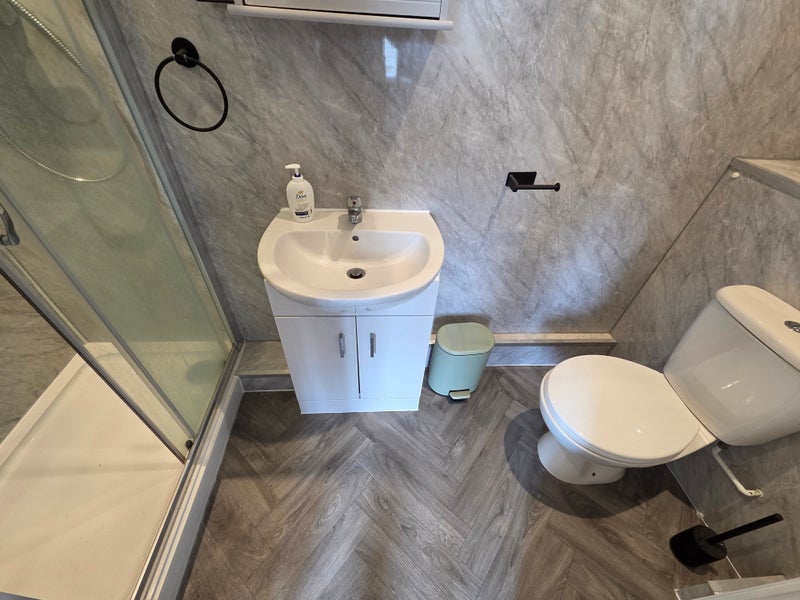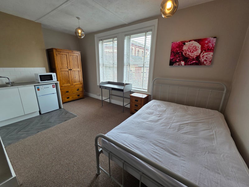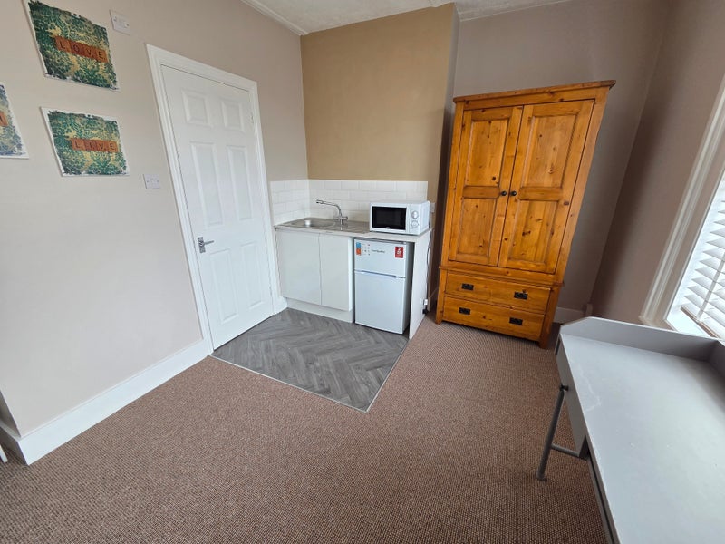 - Spacious bedsit with double bed and mattress, bedside table, desk and wardrobe. En-suite shower room, with sink and w/c. Kitchenette area with cupboards, sink, microwave and undercounter fridge/freezer.