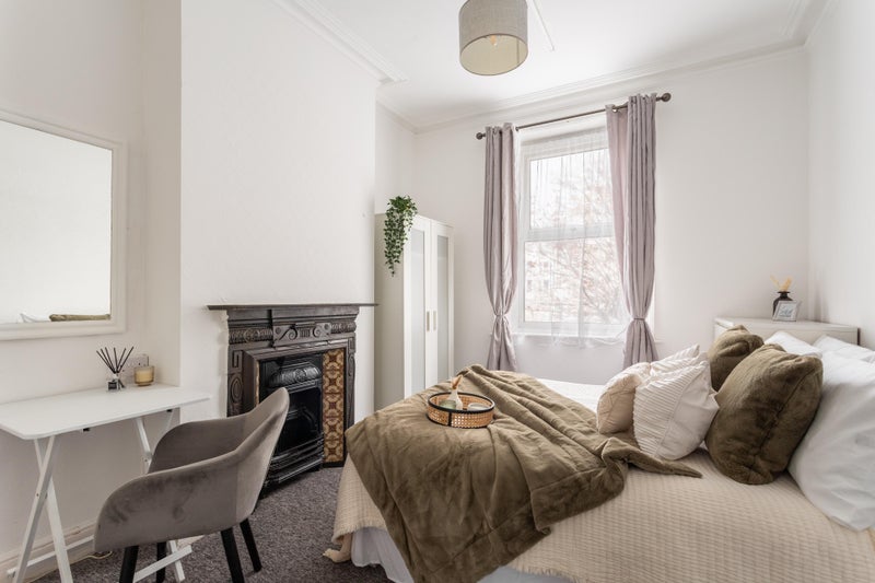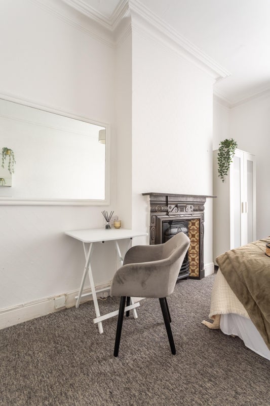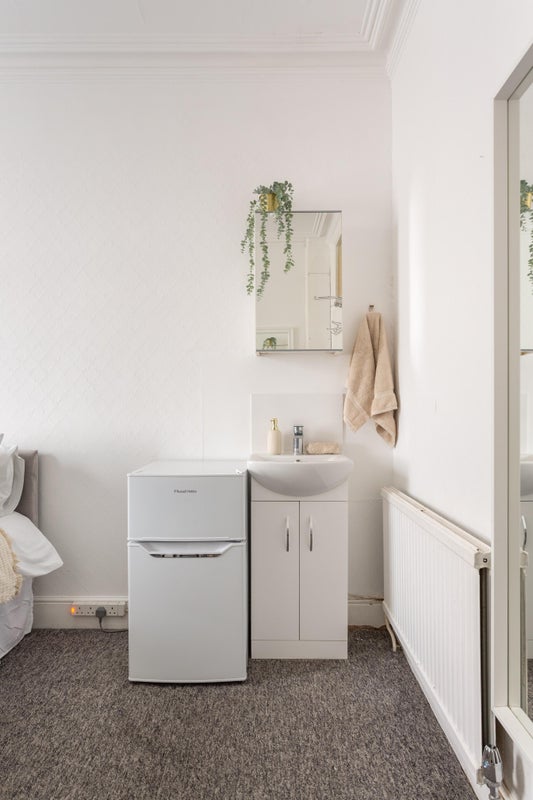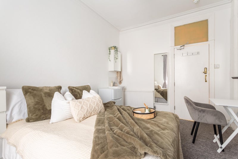 The room is offered fully furnished consisting of a double bed with headboard and mattress, chest of drawers, wardrobe, mirror, basin, bathroom cabinet, desk, chair and fridge freezer.