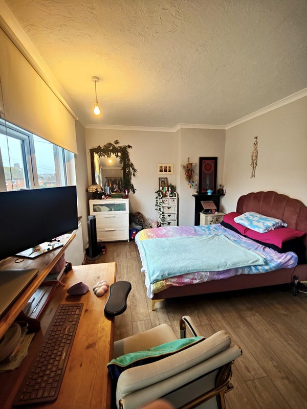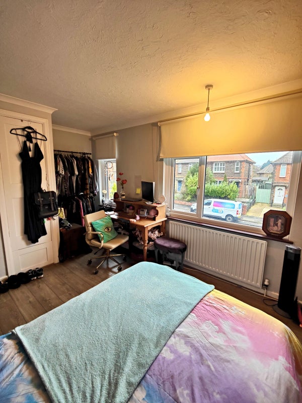 I am offering the front of house larger bedroom to the new tenant which has a built in deep cupboard with a small clothes rail, plenty of room for a double bed, desk and more.
