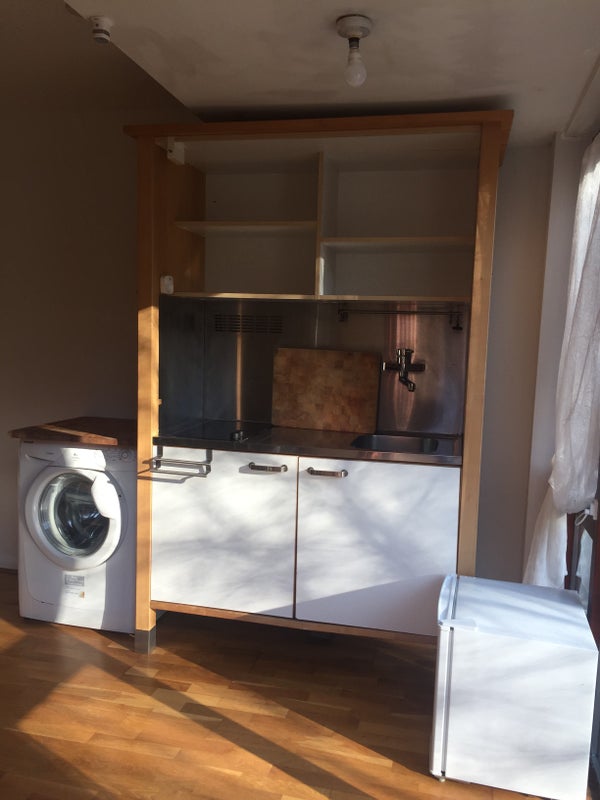 Open-plan sitting room and kitchenette with fridge, freezer and washing machine.
