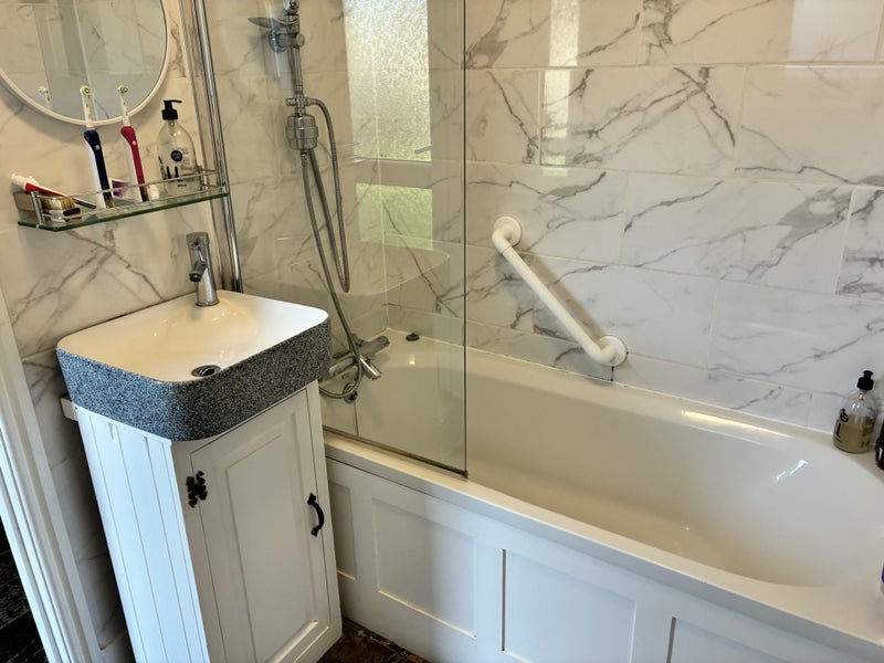 The kitchen is fully equipped with oven, microwave, air fryer, dishwasher. Shared washing machine, tumble dryer in utility. Shared bathroom, with a shower and a bath.